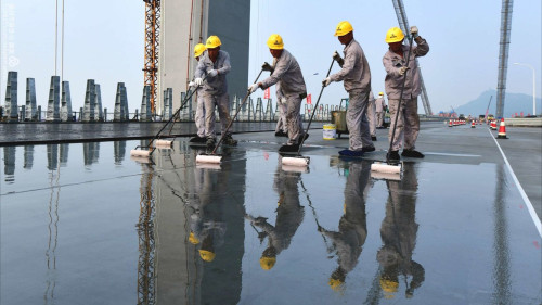 记者看到,施工现场,热浪袭人,工人们挥汗如雨。太多的工人都是汗流浃背,有的工人衣裤尽湿,全部粘粘在身上。有的工人手上抓着“农夫山泉”,一扬脖子,一瓶水就见底。大桥上尽管不时有风,但阵风穿过,也是发热,反而加速人身上的汗流......桥面上,机器轰鸣,来来往往,时而振动,时而静压,粘稠的下面层上又穿了一层保护衣。