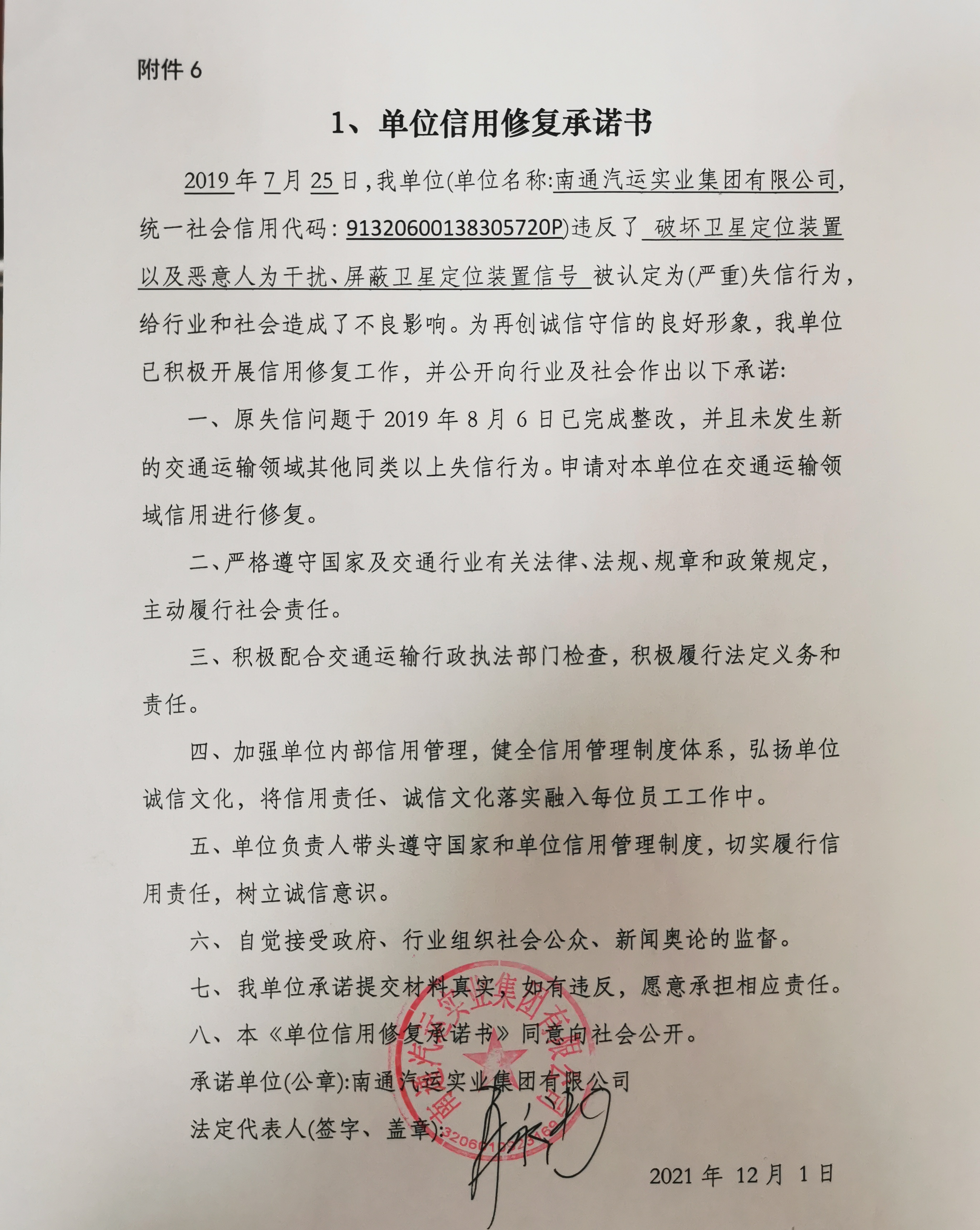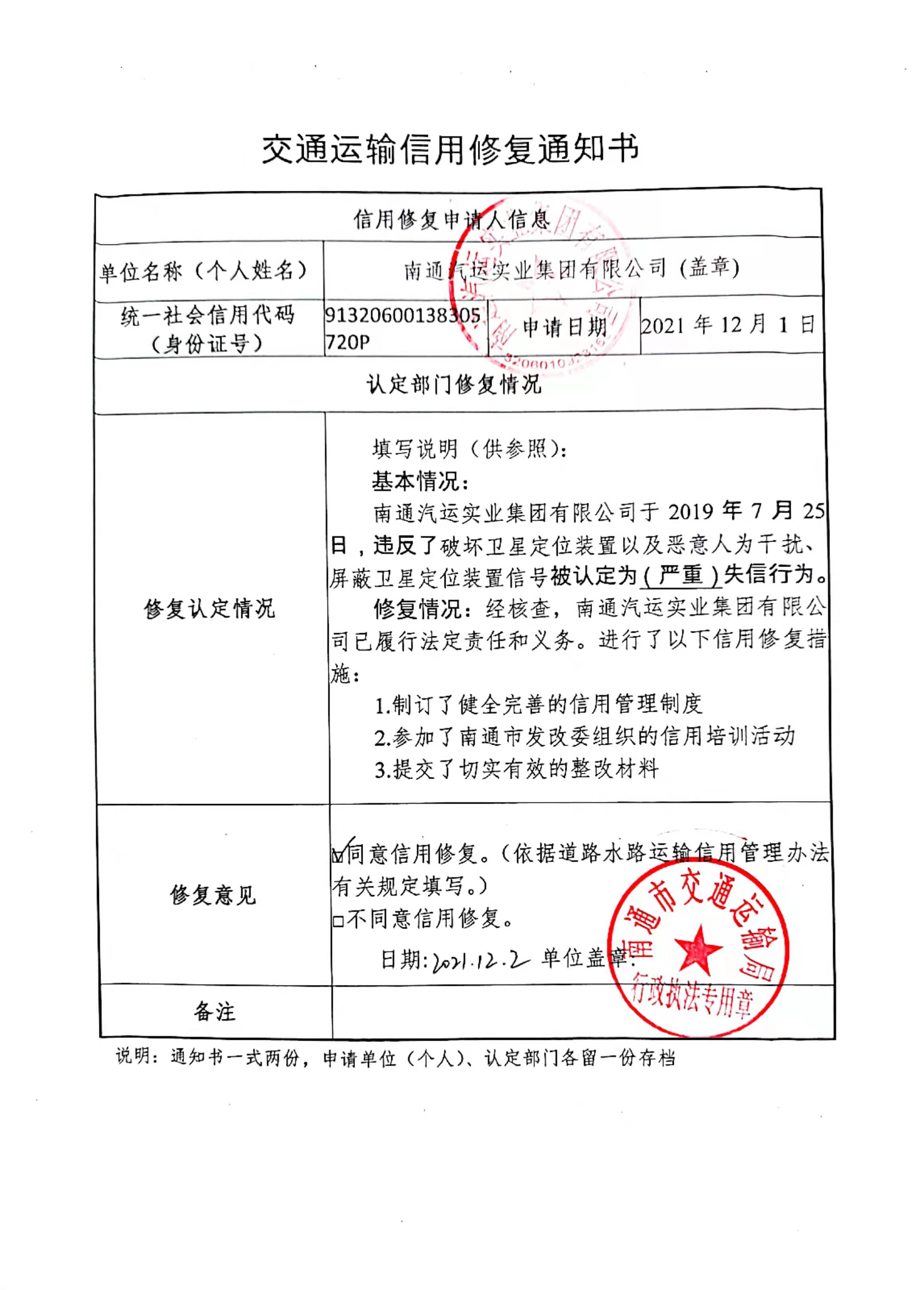南通市交通运输局关于南通汽运实业集团有限公司信用修复的公示