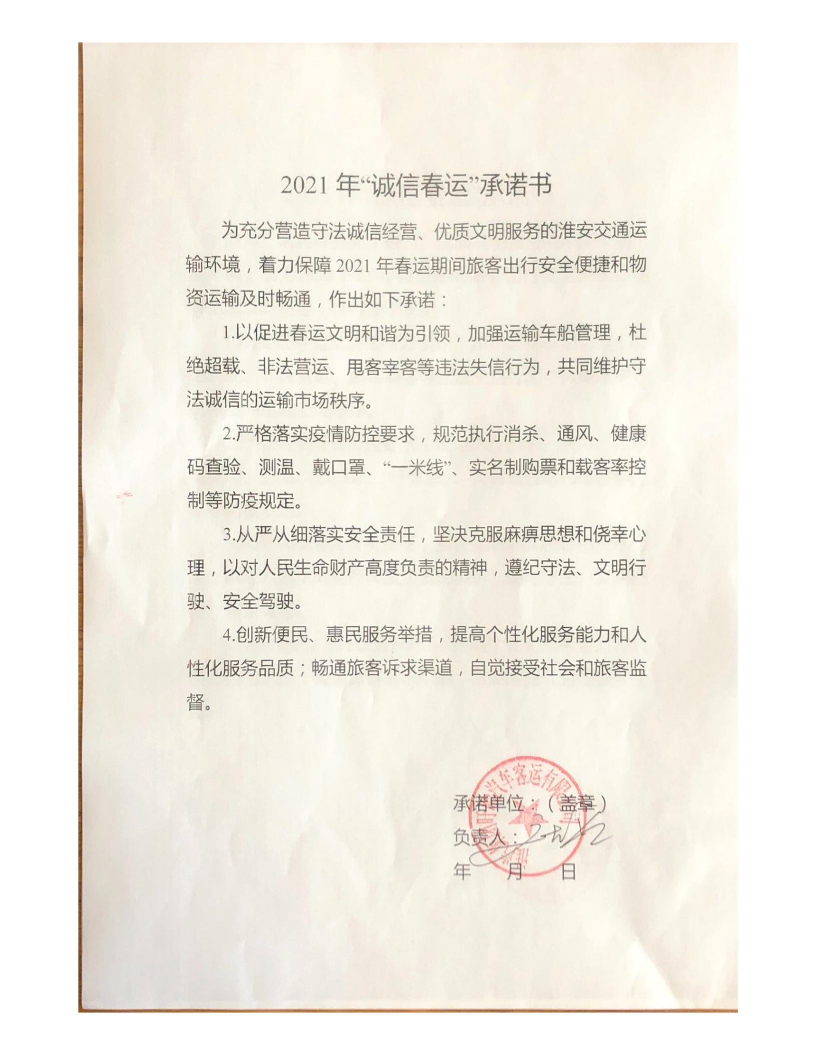 淮汽集团盱眙汽车客运有限公司2021年”诚信春运“承诺书