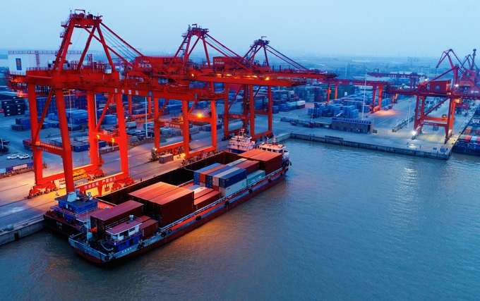 1月4日,在如皋港苏中国际集装箱码头,机械正在有序对泊位停靠的货船进行装卸作业。如皋港当日提供的数据显示,2021年该港口集装箱吞吐量超额完成全年55万标箱目标任务,创造了港口货物吞吐量、集装箱吞吐量“双突破”的喜人成绩。薛 冯 吴树建 摄