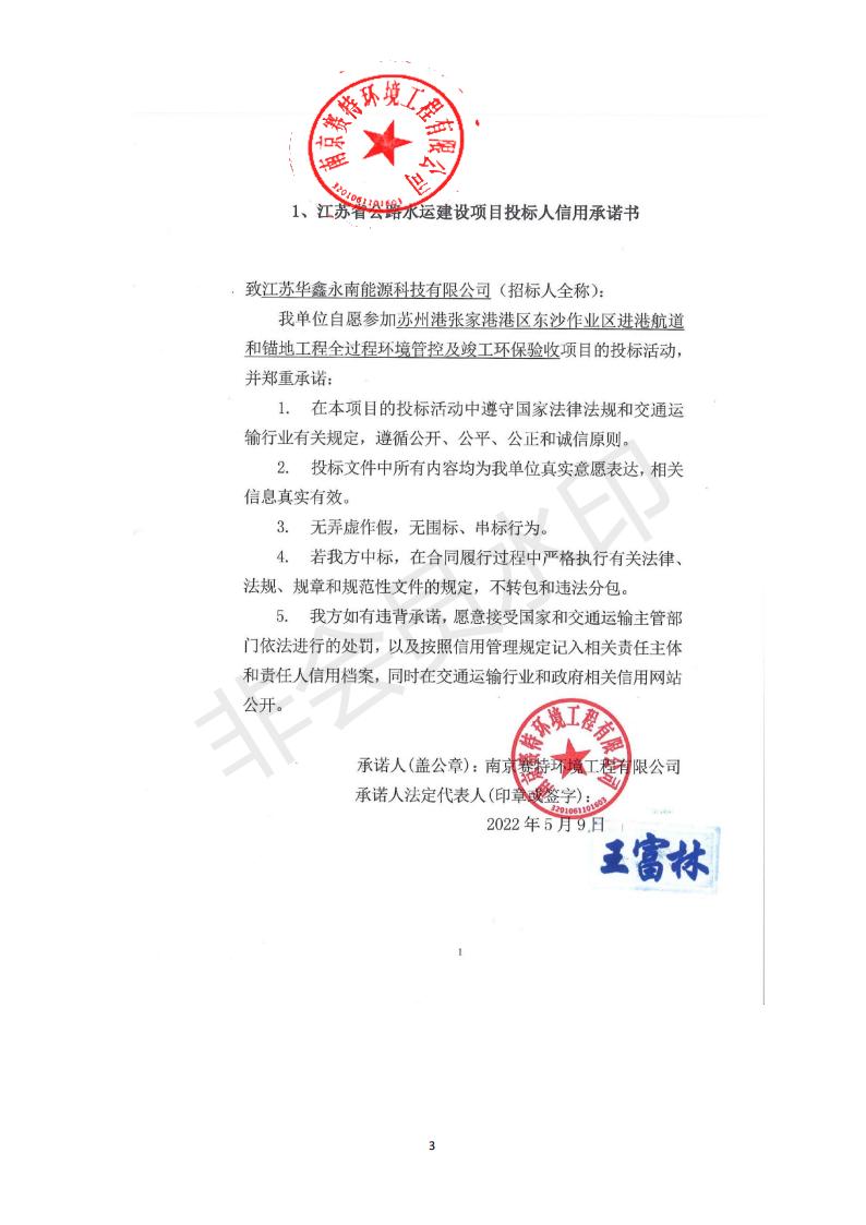苏州张家港市交通运输局公示江苏省公路水运建设项目投标人信用承诺书(南京赛特环境工程有限公司)