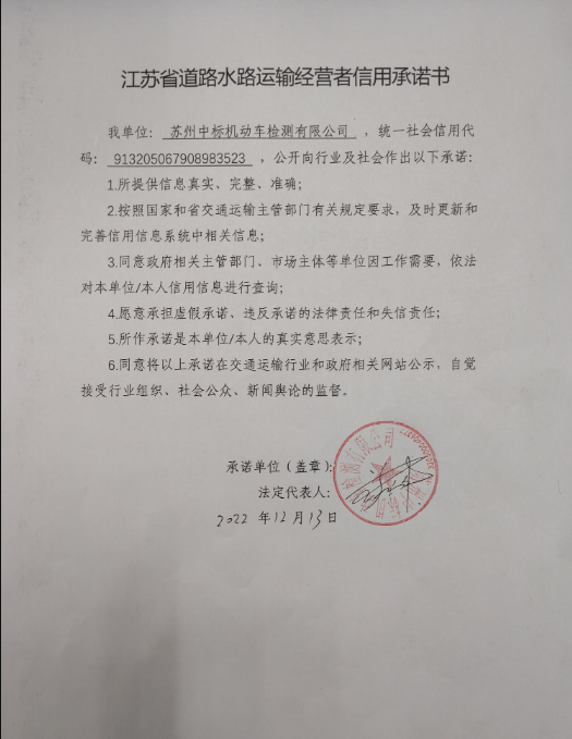 苏州市交通运输局(支队)公示道路水路运输经营者信用承诺书(苏州中标机动车检测有限公司)