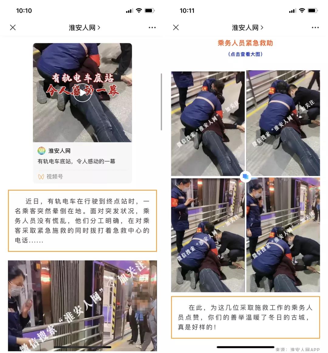2021年11月11日晚,淮安一男子在有轨电车体育馆站候车时突然晕倒,现场乘务员见状连忙冲向前去。男子倒地后还不停抽搐并且有咬舌现象,乘务员猜想他可能是突发癫痫,于是赶忙用手扒开乘客嘴巴,并做了简易压舌板,以防乘客咬到舌头,现场另一名乘务员拨打120电话求救。随后,电车进站,电车司机一起加入救援,并及时将现场情况汇报行车调度员,同时引导围观乘客有序乘车,保障列车正常运营。“当时乘客倒地的时候已经咬到嘴唇了,还出了不少血,我就赶紧扒开他的嘴,弄个压舌板塞了进去。” 乘务员严培培告诉记者,当时男子嘴巴特别紧,她和同事好不容易才把压舌板塞进去,因为之前有受过急救培训,就和同事一起把男子调整成侧卧。通过紧急救护,乘客慢慢恢复意识,电车司机和乘务员又拿来随车药箱为乘客处理擦伤。经与乘客家属联系,了解到乘客确有癫痫病史。在120救护人员和家属到达现场后,确认乘客身体状况暂无需就医。男子家属对于此次施救再三表示感谢,“要不是你们反应那么快,还不知道出什么事呢,真是太感谢了。”