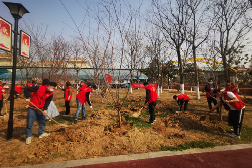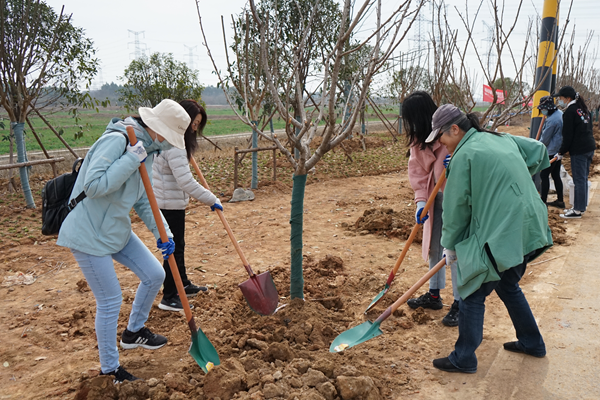 活动现场,参加人员佩戴口罩,统一接受体温检测后开始植树活动。大家分工协作,挥楸挖土、苗木入坑、培实新土、踩实固苗、接水浇灌,现场呈现一片繁忙有序、热火朝天的劳动景象。一番忙碌之后,60余棵樱花树顺利栽植,樱花大道雏形初现。