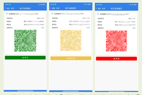 电子运单系统“五必查”功能还创新性地引入了运输企业和驾押人员的信用状况信息展示功能,根据运输企业、驾押人员的最低信用等级,分别赋予电子运单二维码绿、黄、红三种颜色,分别代表信用好(红名单、AAA级、AA级)、信用较差(A级)、信用差(B级和黑名单),基于信用状况建立运输企业、驾押人员和车辆择优选择机制。装货人在实施“五必查”时,通过查验电子运单二维码,根据二维码颜色可以快速识别运输企业和驾押人员信用状况,评估其诚信经营和安全风险水平,选择信用好、安全水平高的运输企业、驾押人员和车辆执行运输任务。