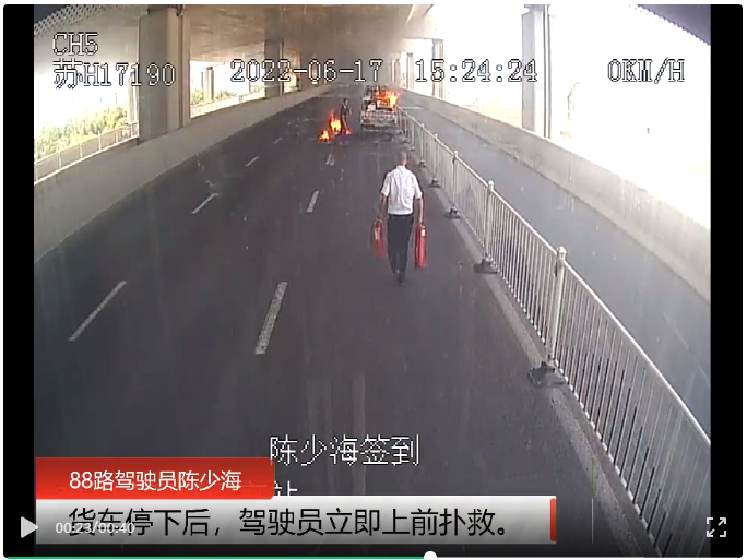 6月17日15:20左右,陈少海驾驶公交车刚刚驶离淮钢新村站,身旁一阵阵急促的喇叭声引起了他的注意。陈师傅通过观察后发现,公交车左后方有一辆正在行驶的小型货车后车厢冒起了大火,周围的车辆纷纷鸣笛提醒。陈师傅见状后也开始向货车鸣笛,想引起对方的注意。终于,货车司机发现了这一异常情况,迅速将车停在了路边,货车上的两位驾乘人员急忙下车开展自救,其中一名师傅不顾自身危险伸手就将车上着火的货物扯下,结果被火灼伤了,眼见车厢里的纸板剧烈燃烧,火势越来越大,两位货车师傅心急如焚。时间就是生命,发现小货车靠边停下后,陈少海没有丝毫犹豫,他迅速将车辆停在安全位置,一手拎起车内两罐灭火器就冲向正在燃烧的货车,并呼喊货车师傅帮忙,他将手中的一罐灭火器递给货车司机,大声提醒他们注意安全,不要被烫伤,随后便与货车司机一起拿着灭火器向着货车车厢的着火点喷去。在两人的配合下,火势很快得到了控制,为了避免火势复燃,两名货车师傅抓紧时间清理车上着火的货物,而陈少海也拎着灭火器站在一旁防止货车再次起火。很快,着火的货物被清理出来暂时放置在地上,不会再对车辆造成危险,考虑到不能耽误乘客们的时间,陈师傅叮嘱货车司机一定要将现场清理完毕后,重新回到车上继续运营。望着驶离的公交车,货车师傅在原地双手合十作揖感谢,而陈少海师傅也以一个敬礼回应了货车师傅。