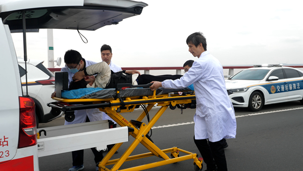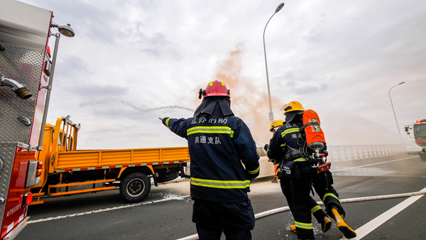 本次演练紧扣大桥管理特点,注重联动性、实用性,突出跨省市和水陆同步的应急救援配合,设置大桥行驶车辆在江苏界内追尾失火、驾乘人员受伤、车辆货物坠江、船舶避让失控导致撞桥风险等连锁式“事故”。沪苏两地交通警察、交通执法、海事、长江航道、消防救援、医疗急救、运营单位等10支涉路涉水队伍的50余名队员和20余辆(艘)车辆、船舶参与演练。
