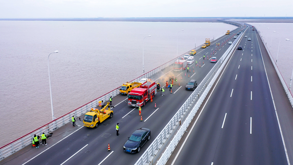 由于事故地点位于崇启大桥上海往南通方向,江苏方交警、养排部门到达现场,需跨越整座大桥绕行至事发地。根据“崇启大桥沪苏双方联合应急处置流程”,上海交警、交通执法队员首先跨省前往事故点进行先期处置,随后江苏交警、交通执法队员到场交接处置,并协助消防和医疗开展伤员救援工作。
