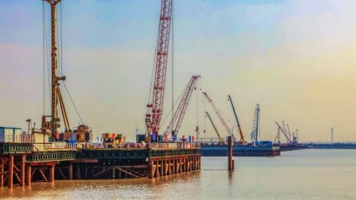 4月29日,中铁大桥局沪渝蓉高铁沪宁段站前V标崇启公铁长江大桥水上3、4#主墩施工现场,机器轰鸣,焊花四溅。“五一”期间,该项目部有500余名员工坚守岗位铆足劲,用辛勤的劳动加快工程建设。目前,大桥南北两岸近2km栈桥铺设完成、水上钻孔平台安装完成,正在进行水上和南北岸公铁合建段引桥先行用地范围内钻孔桩施工。