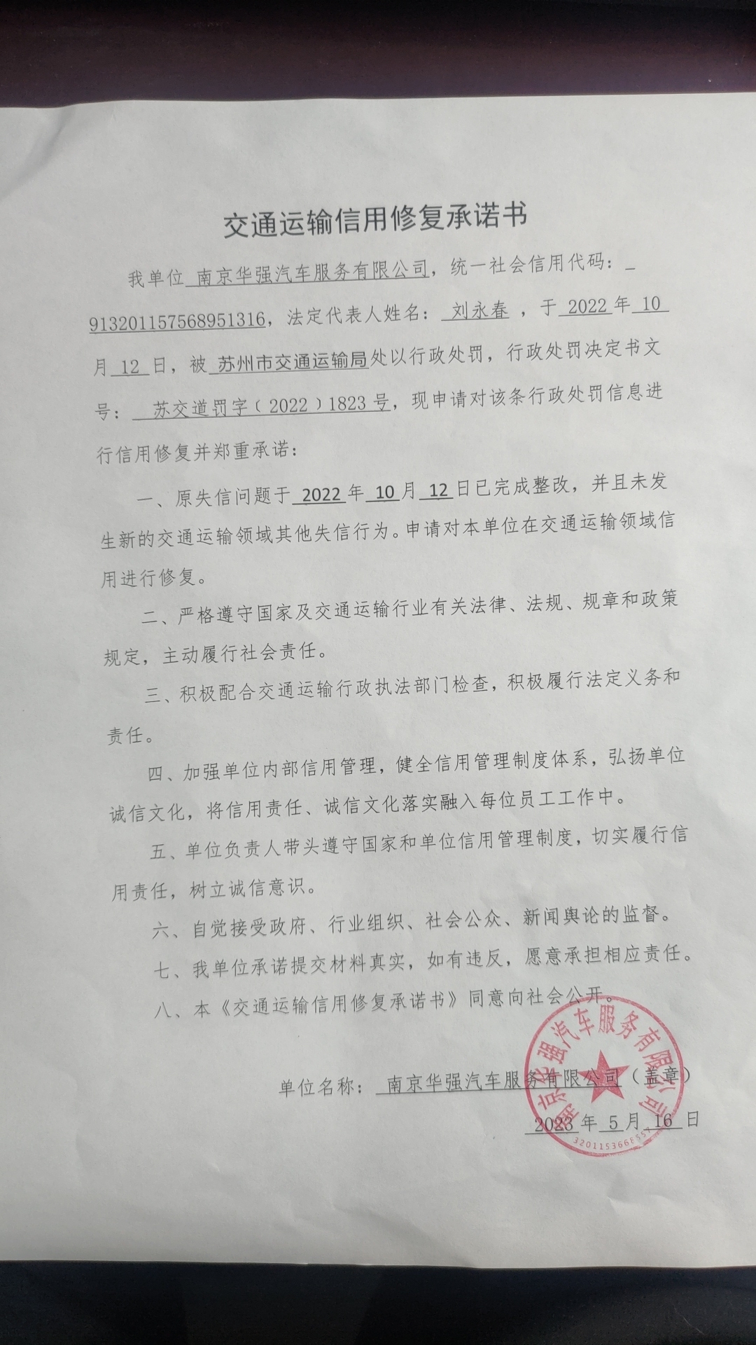 苏州市交通运输局(支队)公示行政处罚信息信用修复承诺书(南京华强汽车服务有限公司1823)