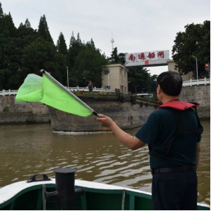 南通船闸排档艇人员站在甲板上开展日常护航,指挥引航道内船舶安全航行。