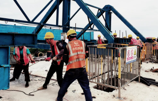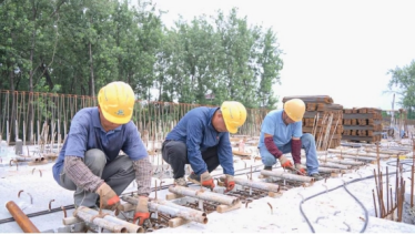 宿连航道桥梁2标室外作业人员进行钢筋绑扎施工。