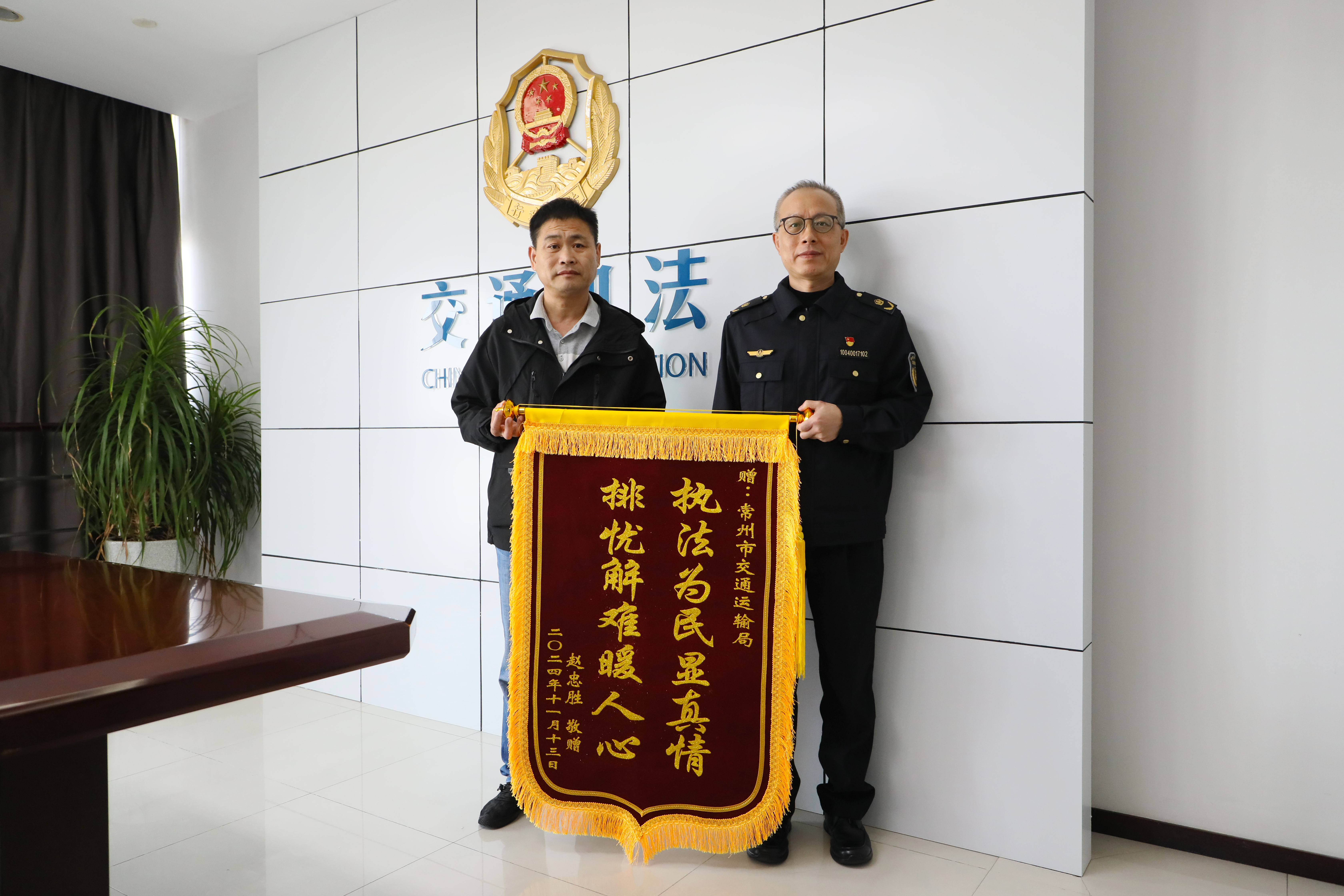 “非常感谢交通执法支队的领导们,帮助我顺利考上出租车从业资格证,以后我也可以正大光明的从事客运经营了。”11月13日上午,驾驶员赵师傅将一面题有“执法为民显真情 排忧解难暖人心”的锦旗送到了常州市交通执法部门,感谢在考取从业资格证过程中,交通执法部门的“一对一”热心帮助和耐心服务。