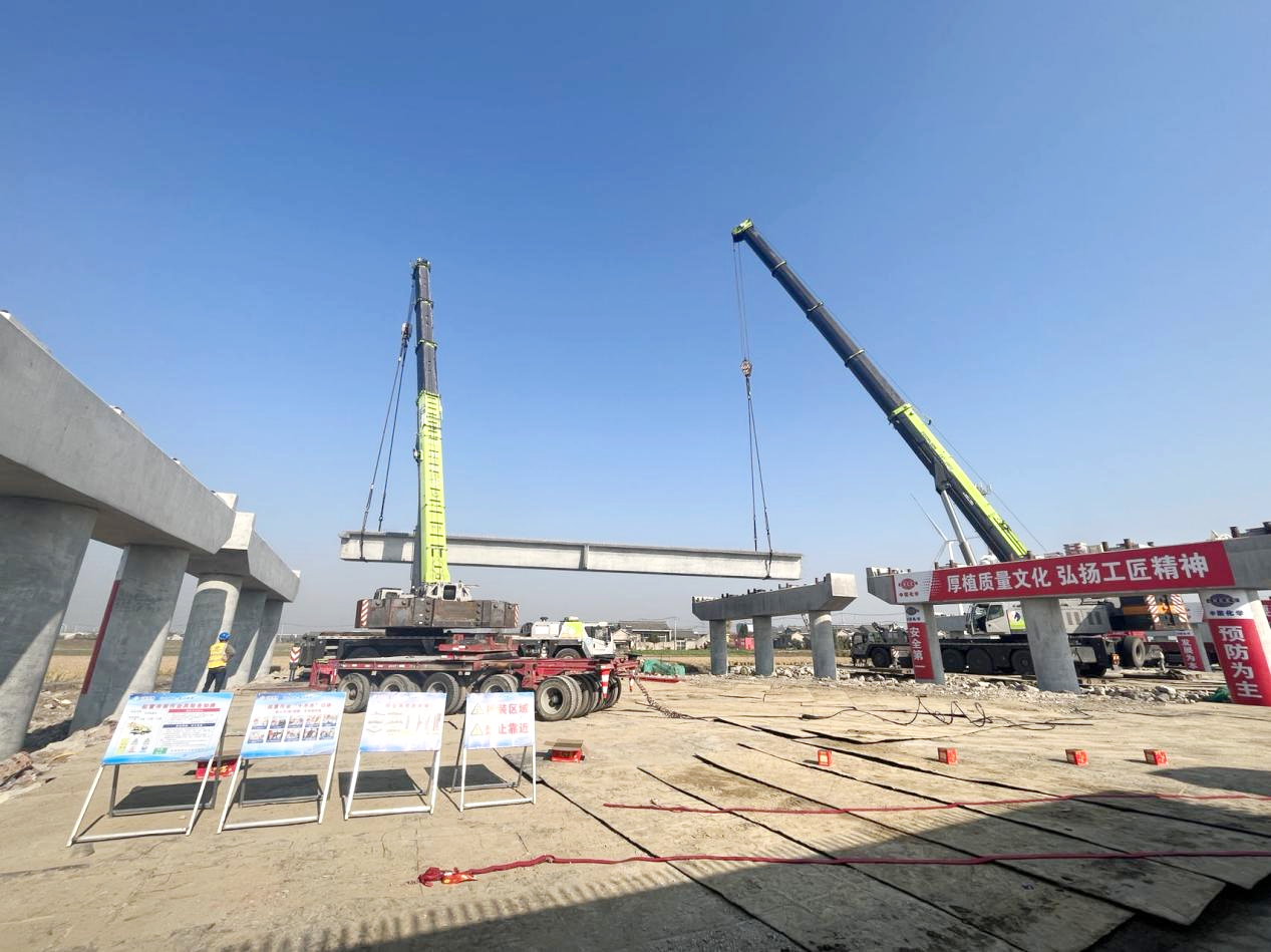 12月2日,由宁盐高速扬州段5标预制箱梁场生产的首批箱梁在三垛互通主线桥顺利架设,这也是宁盐高速高邮段首次架梁,标志着宁盐高速高邮段正式进入“产梁、验梁、运梁、架梁”的循环作业阶段,桥梁上部结构施工进入“快车道”。