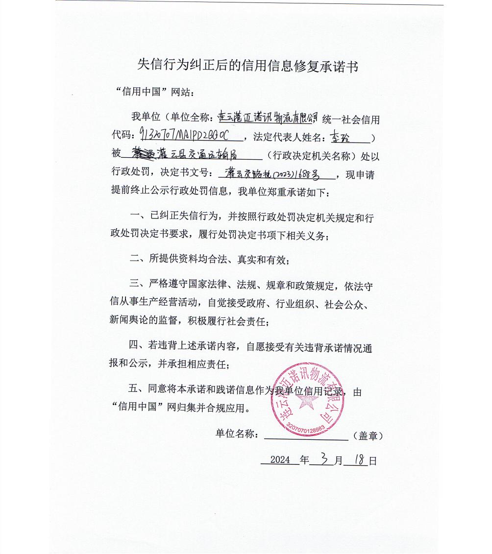 连云港市交通运输局公示信用修复承诺书