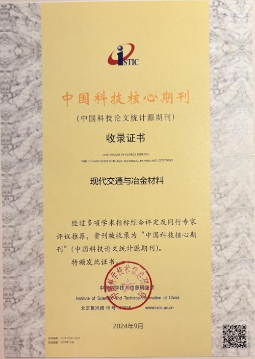 近日,2024年“中国科技论文统计结果发布会暨中国一流科技论文世界影响力评价论坛”在北京召开。会上,中国科学技术信息研究所发布了《2024年版中国科技期刊引证报告》,江苏综合交通运输学会和江苏金属学会主办的《现代交通与冶金材料》期刊被正式收录为“中国科技核心期刊”(中国科技论文统计源期刊)。