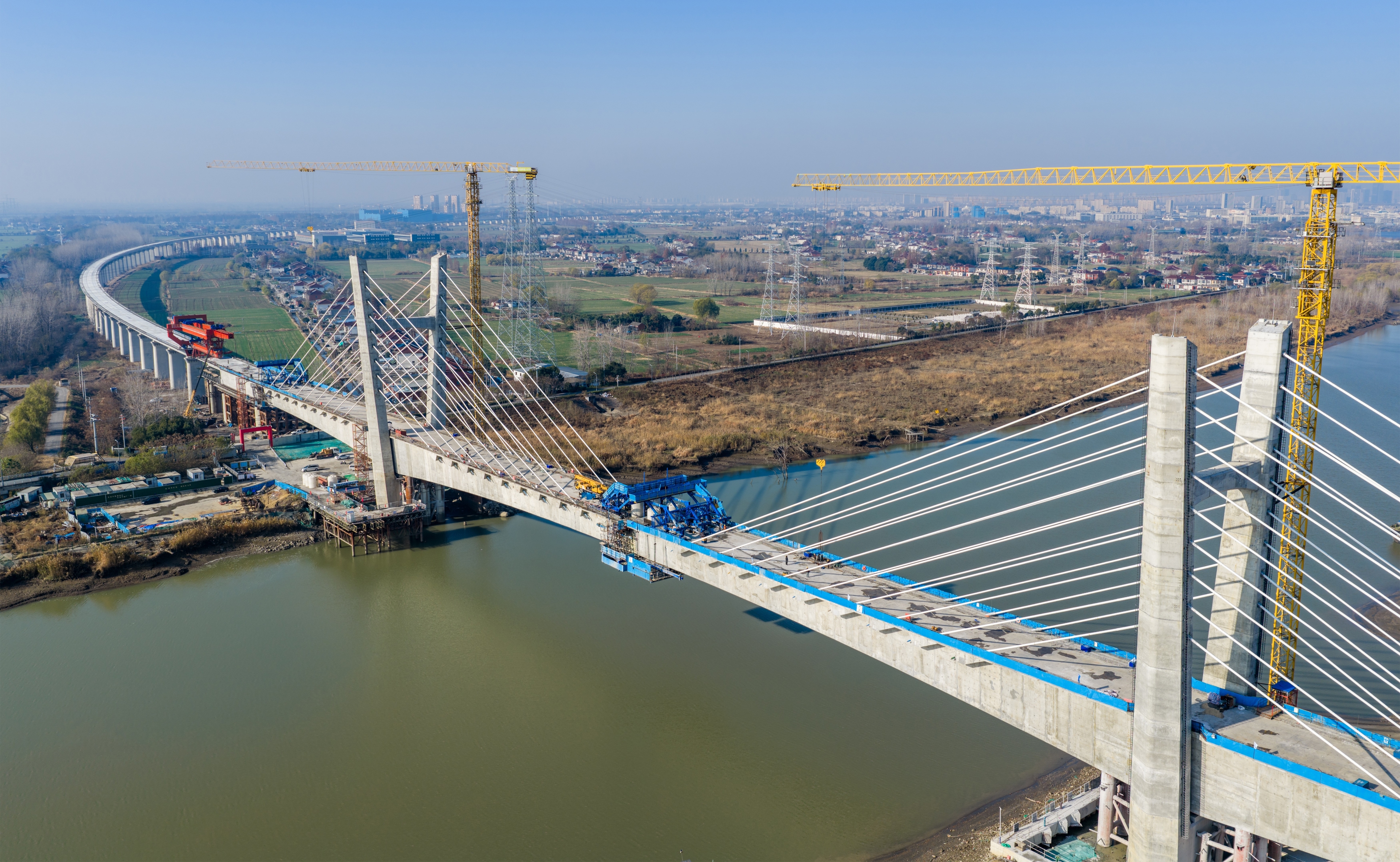 12月14日,北沿江高铁扬州段跨芒稻河斜拉桥合龙。