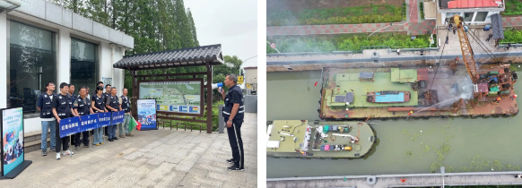在盐邵船闸开展综合消防演练,模拟闸室船舶失火、电动自行车充电时突发火灾场景,现场人员立即开展自救、报警、疏散逃生等工作,救援人员接警后迅速探明火源位置、种类,扑灭火灾,全程分工明确、衔接紧密、有序科学。