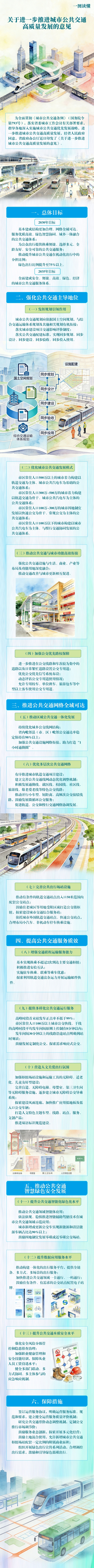 《意见》包括总体目标、重点任务和保障措施3个部分、17条措施,聚焦为公众出行提供换乘便捷、选择多元、全龄友好、安全可靠的公共交通服务,推动提升城市公共交通在机动化出行中的分担比例,2030年绿色出行比例提升至75%以上,2035年全面建成安全、便捷、高效、绿色、经济的城市公共交通服务体系。