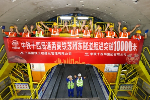 3月30日,在苏州斜塘河地下20多米深处,通苏嘉甬高铁苏州东隧道“通甬园梦号”盾构机掘进总里程成功突破10000米。